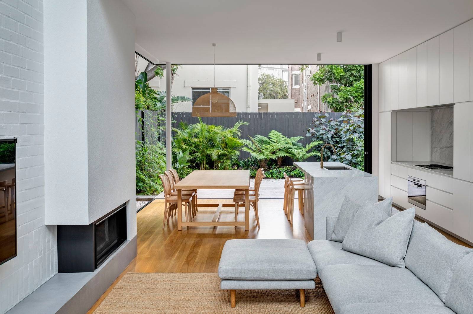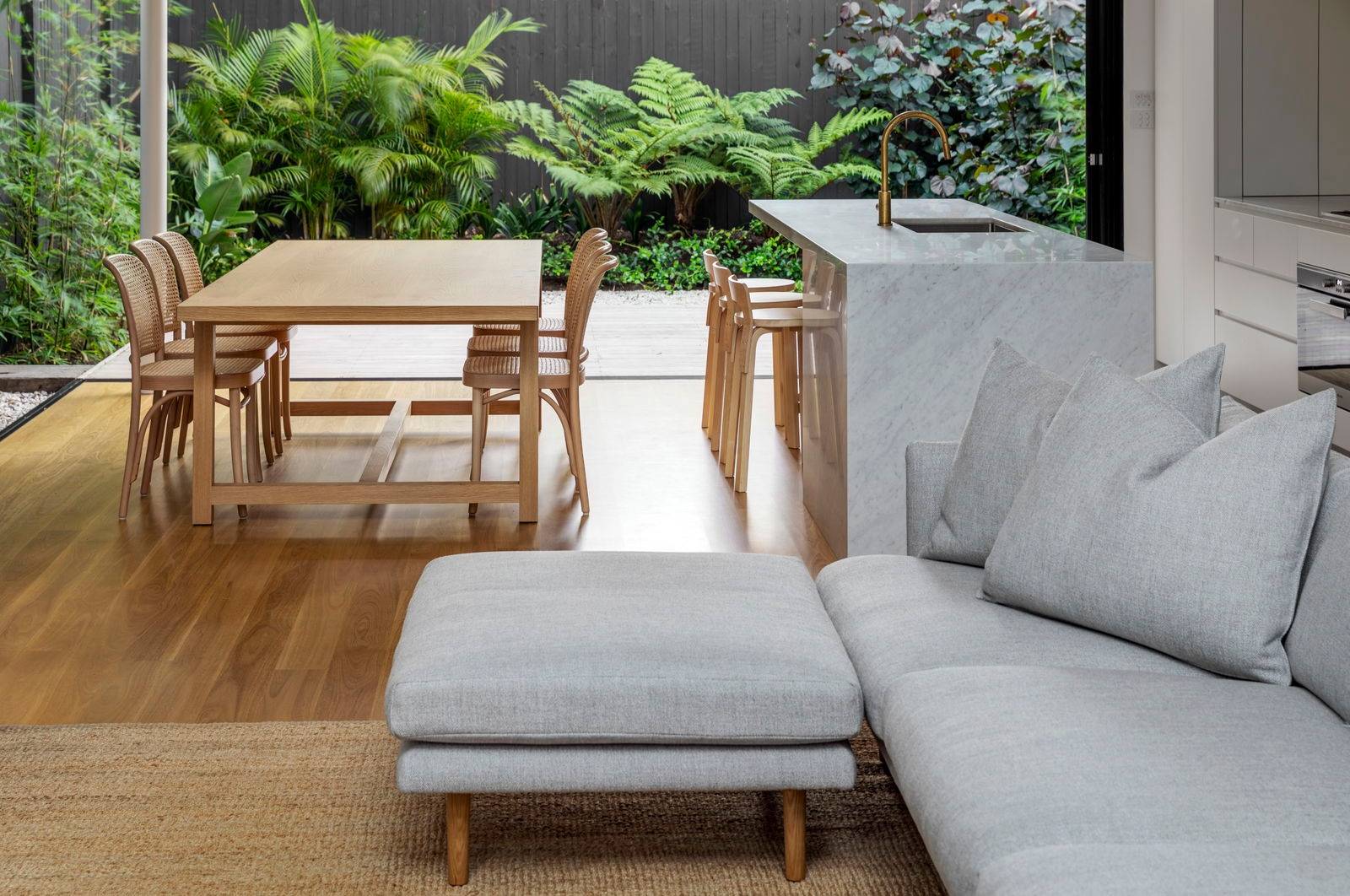 - This entire space dissolves seamlessly towards the east-facing courtyard, designed to capture the glorious morning sun. Walls of glass retract, erasing the boundaries between the chic timber floors indoors and the curated paving stones of your private alfresco haven. Imagine mornings bathed in golden light, rinsing off under the outdoor shower amidst your verdant, jungle-inspired escape, enveloped by gentle sea breezes.