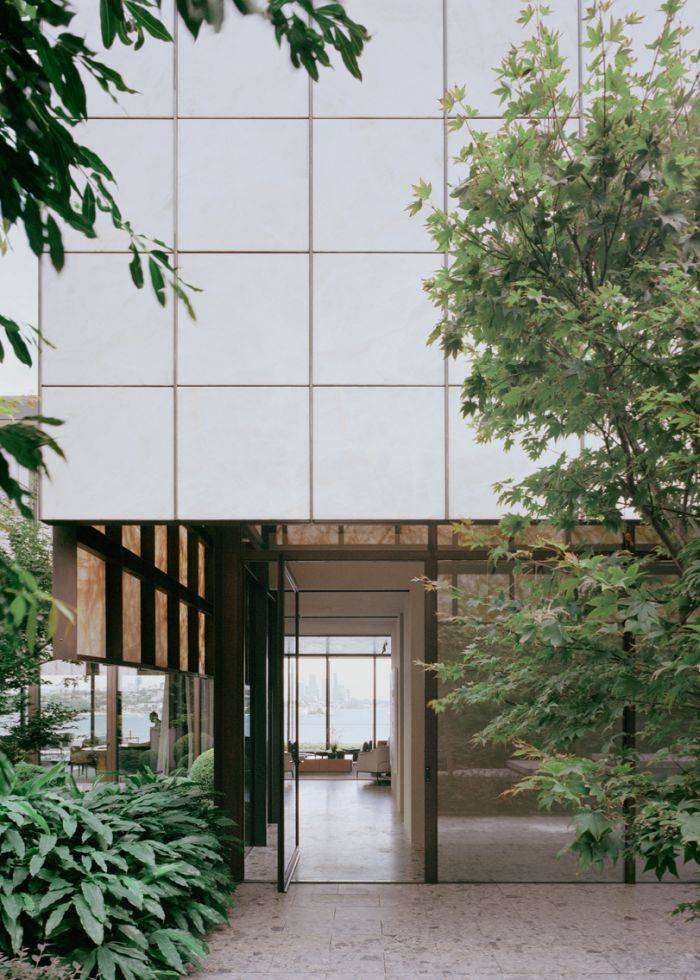 Panels of luminous onyx, framed in blackened stainless steel, form a sculptural veil around the home — suspended from the roof edge or rising from the terrace — allowing dappled light to filter gently into the interiors. The interplay of stone, glass, and shadow creates an atmosphere that is both private and poetic.