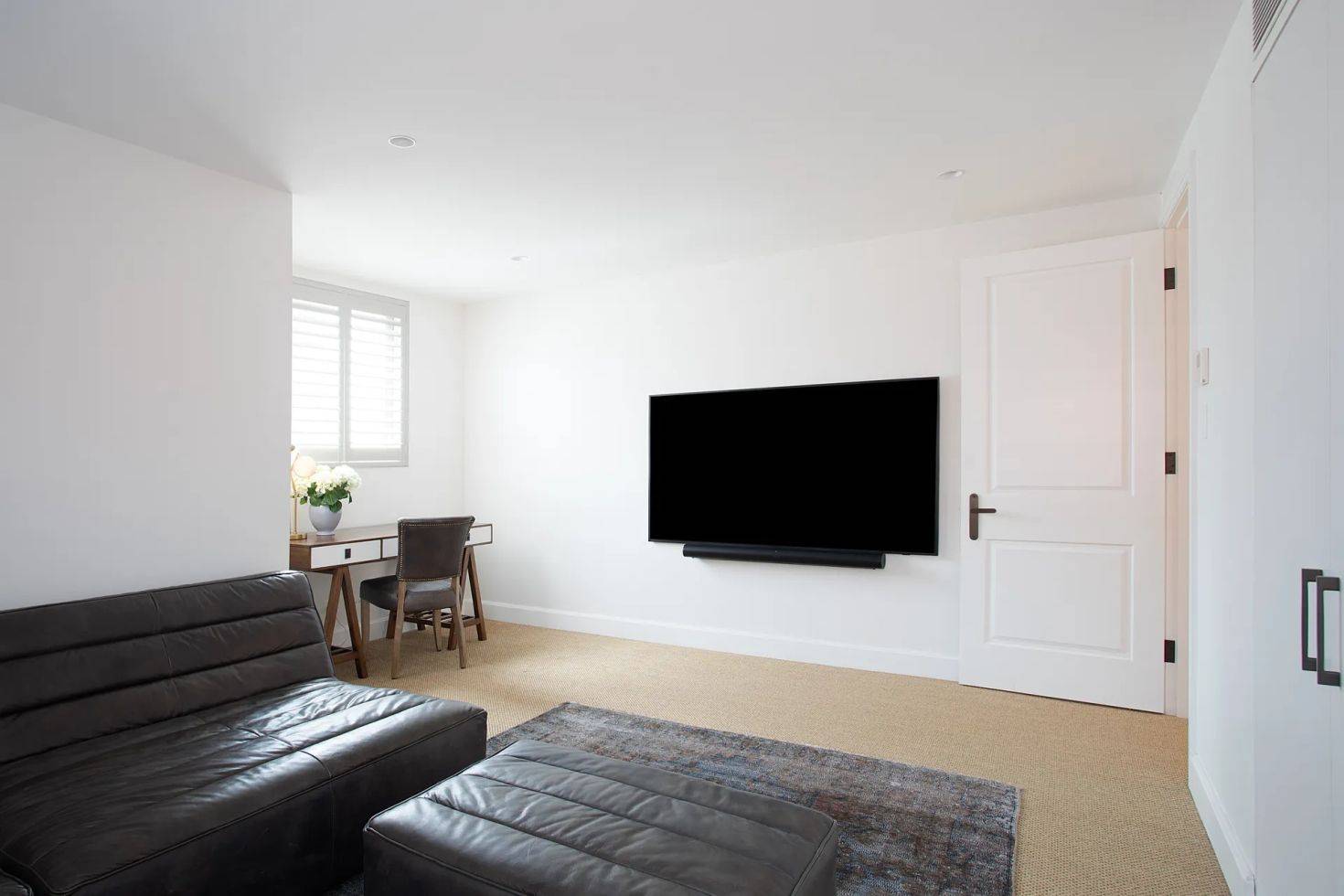 - A dedicated media room on the first level offers a quiet retreat with sofa and desk for remote work or evening movie sessions.
