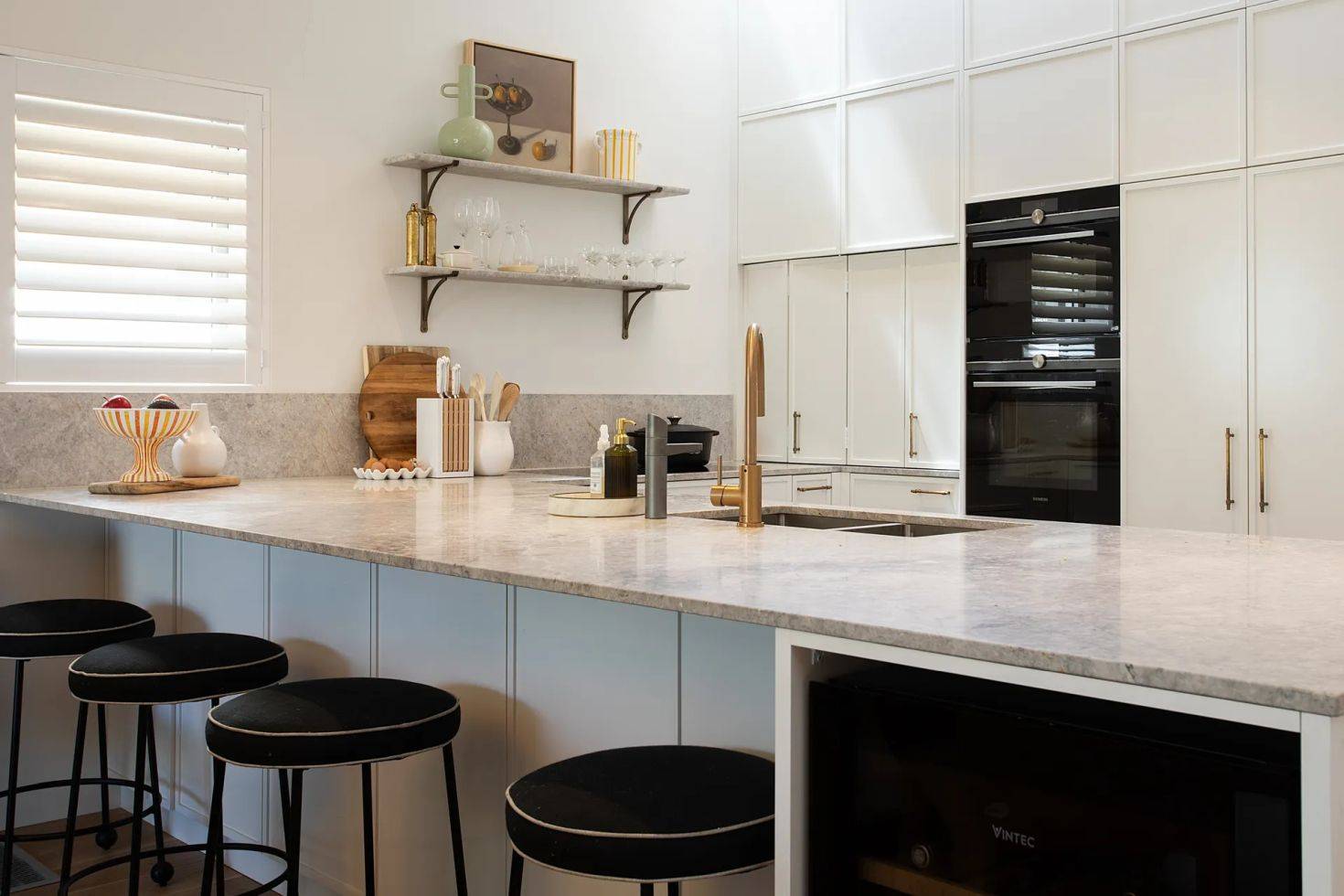 - The kitchen delivers refined luxury with its raw marble waterfall benchtop, bespoke cabinetry, and gold fixtures.