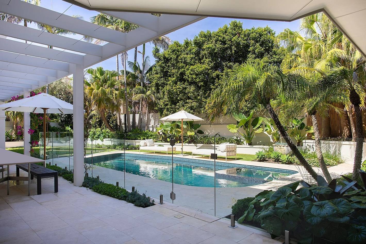 Expansive floor-to-ceiling glass walls invite an abundance of natural light while framing the Mediterranean-style pool as a living work of art, an ever-present focal point that blurs the boundary between indoors and out. Each space unfolds with effortless flow, designed to capture and celebrate uninterrupted harbour and beach vistas from every angle.