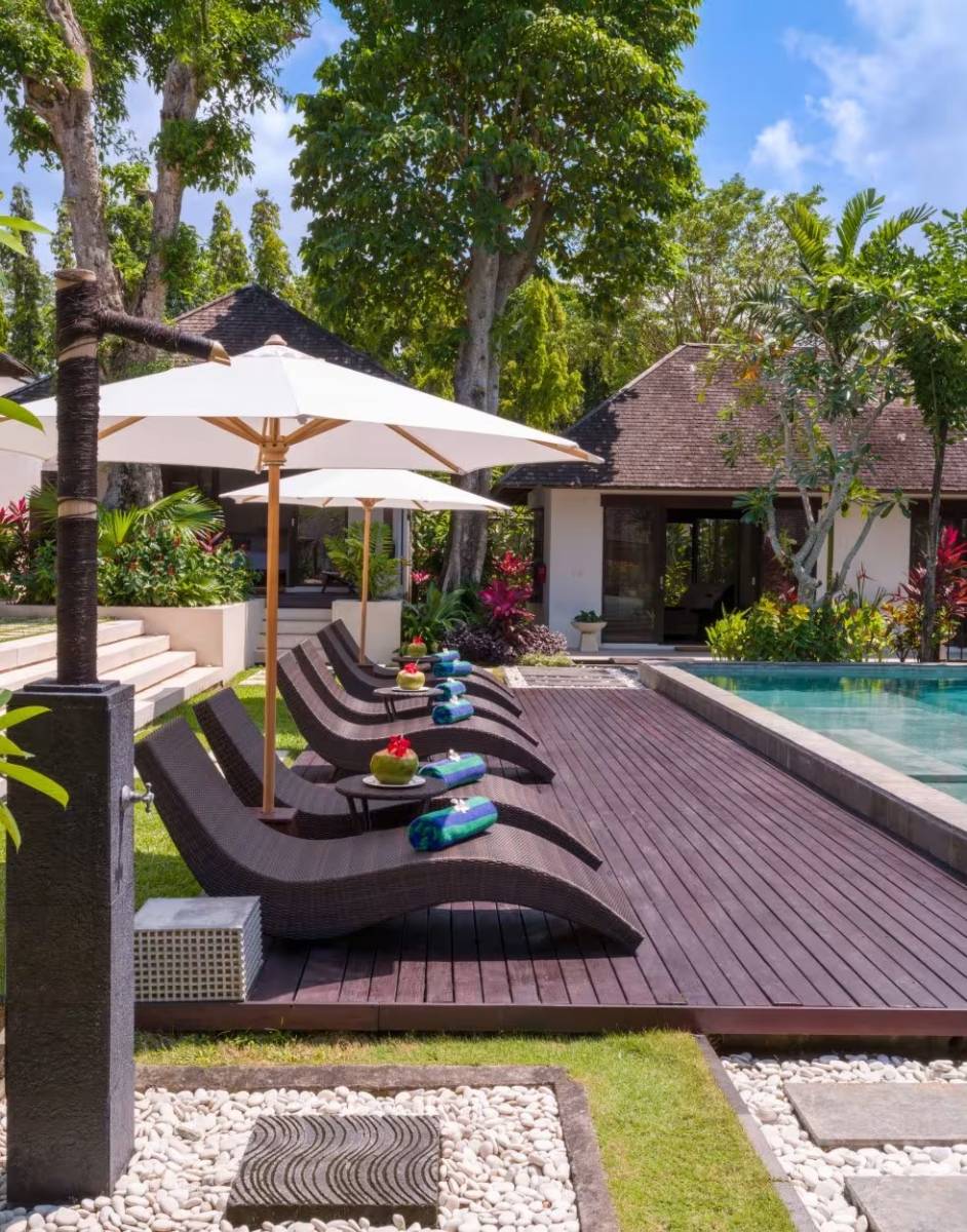 The architect designed Villa comprises 5 separate pavilions with feature ceilings including 4 double bedrooms, a multi-media room, a separate modern kitchen, and a magnificent open air main pavilion. The infinity pool is fronted by hardwood decking with sunbeds. It is designed with multiple depths so children of all ages can enjoy it. The lower plunge pool fronts the river where you sometimes see fish or swimming lizards.