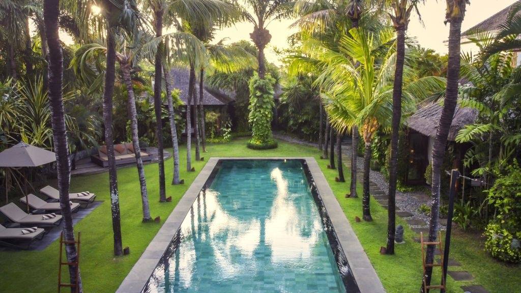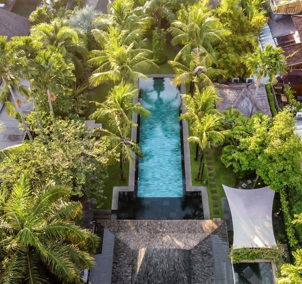 Set within an expansive 1,900sqm tropical garden, Shambala Seminyak is a private sanctuary where sunlight filters through lush greenery and a striking 21m swimming pool forms the centerpiece of the estate.