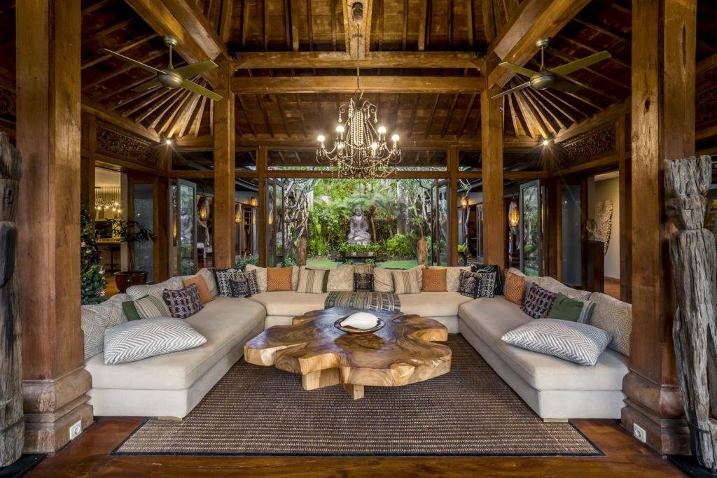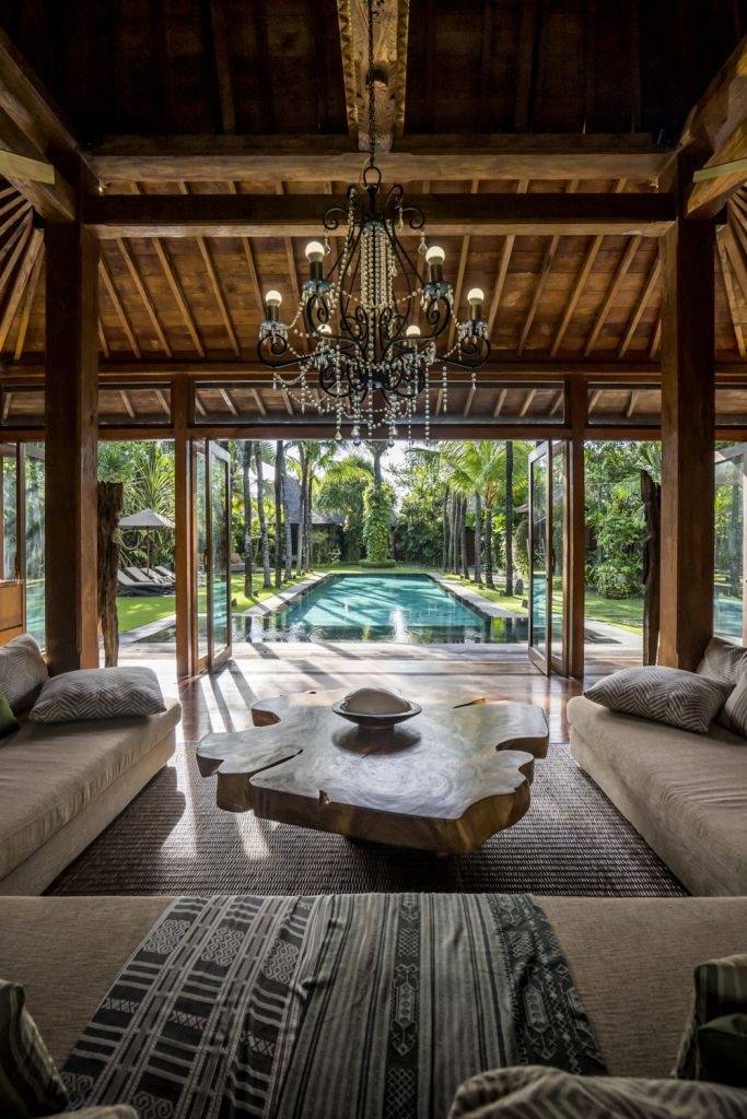 - The imposing antique Javanese joglo that forms the heart of the villa’s comfortable living room evokes an authentic sense of place. Below the soaring roof is a huge U-shaped couch set around a coffee table, while an ornate crystal chandelier adds an elegant decorative element and a small army of wooden statues stand in attendance. Glass folding doors open widely to admit a cooling breeze and the peaceful sound of trickling water emanates throughout the pavilion. The dining room adjoining the living area is furnished with a solid wood table and ten chairs crafted in woven bamboo.