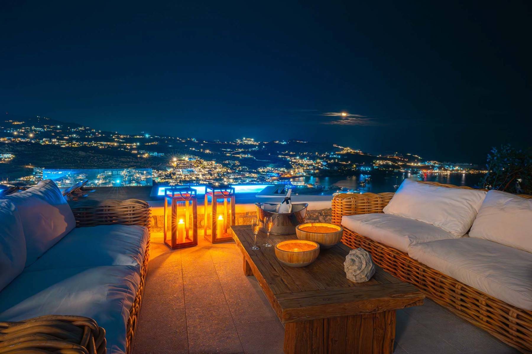 - The villa’s expansive terrace has every feature to keep any escapist entertained; large open spaces, plenty of outdoor lounging and eating options, a grand infinity pool, a private gym, a heated jacuzzi for up to 14, panoramic views, and facilities to cater for 20 guests – what more could you wish for? Enjoy the soothing atmosphere with a drink from the pool bar and, before it’s time to get ready for the bars, take a last refreshing plunge in the pool.