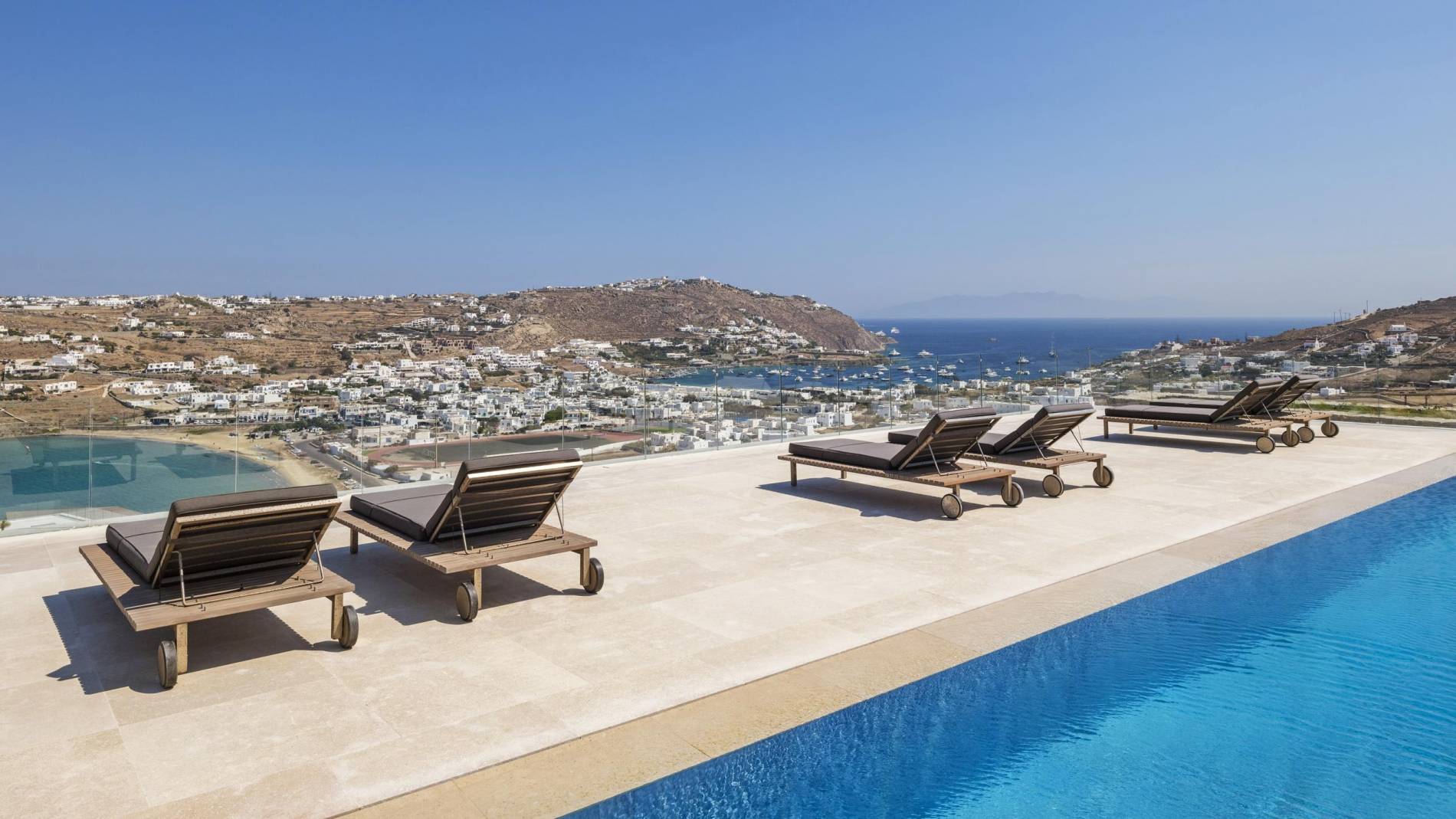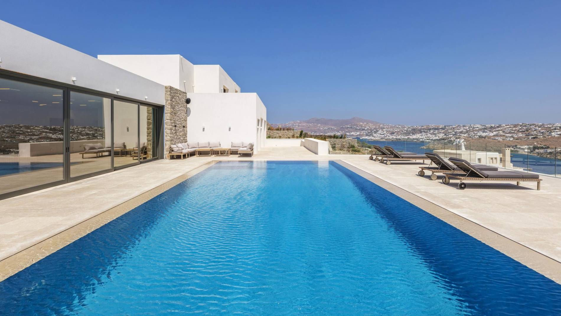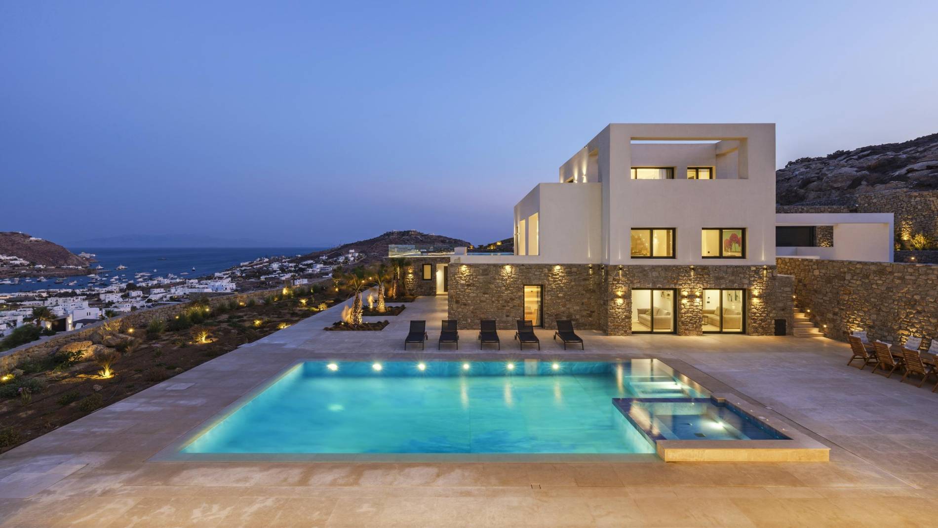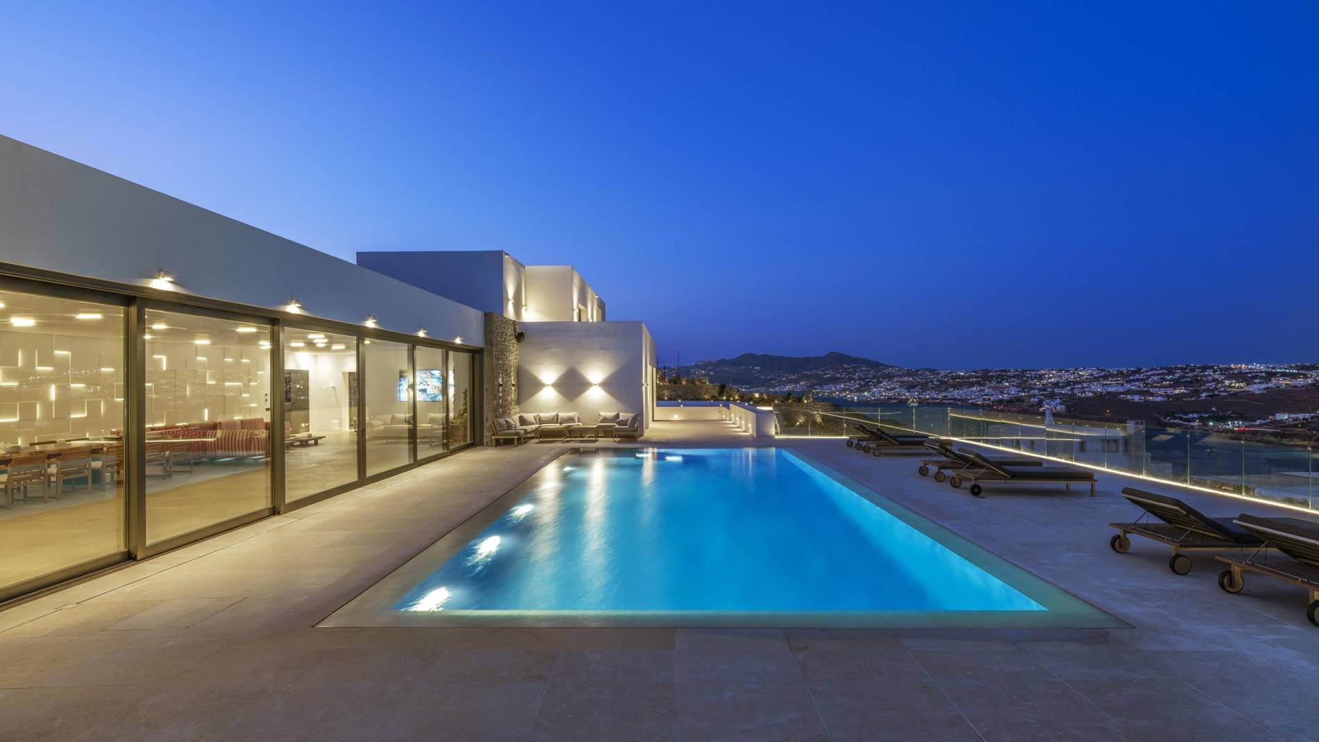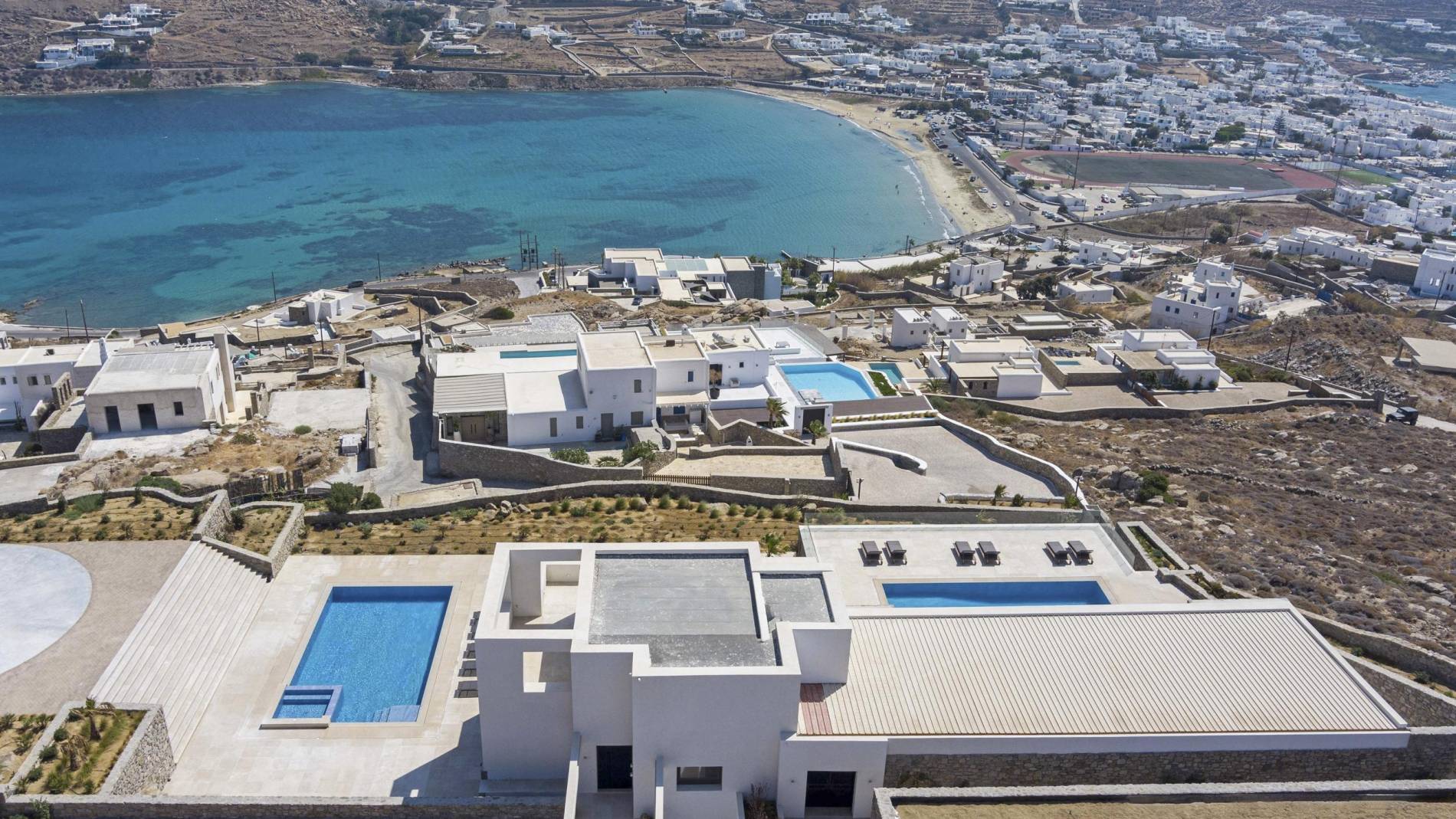 Perched above the shimmering coastline of Korfos Bay, Villa 1443 is a newly built sanctuary of rare distinction, commanding panoramic views that sweep across Ornos Beach and the iconic skyline of Mykonos Town.