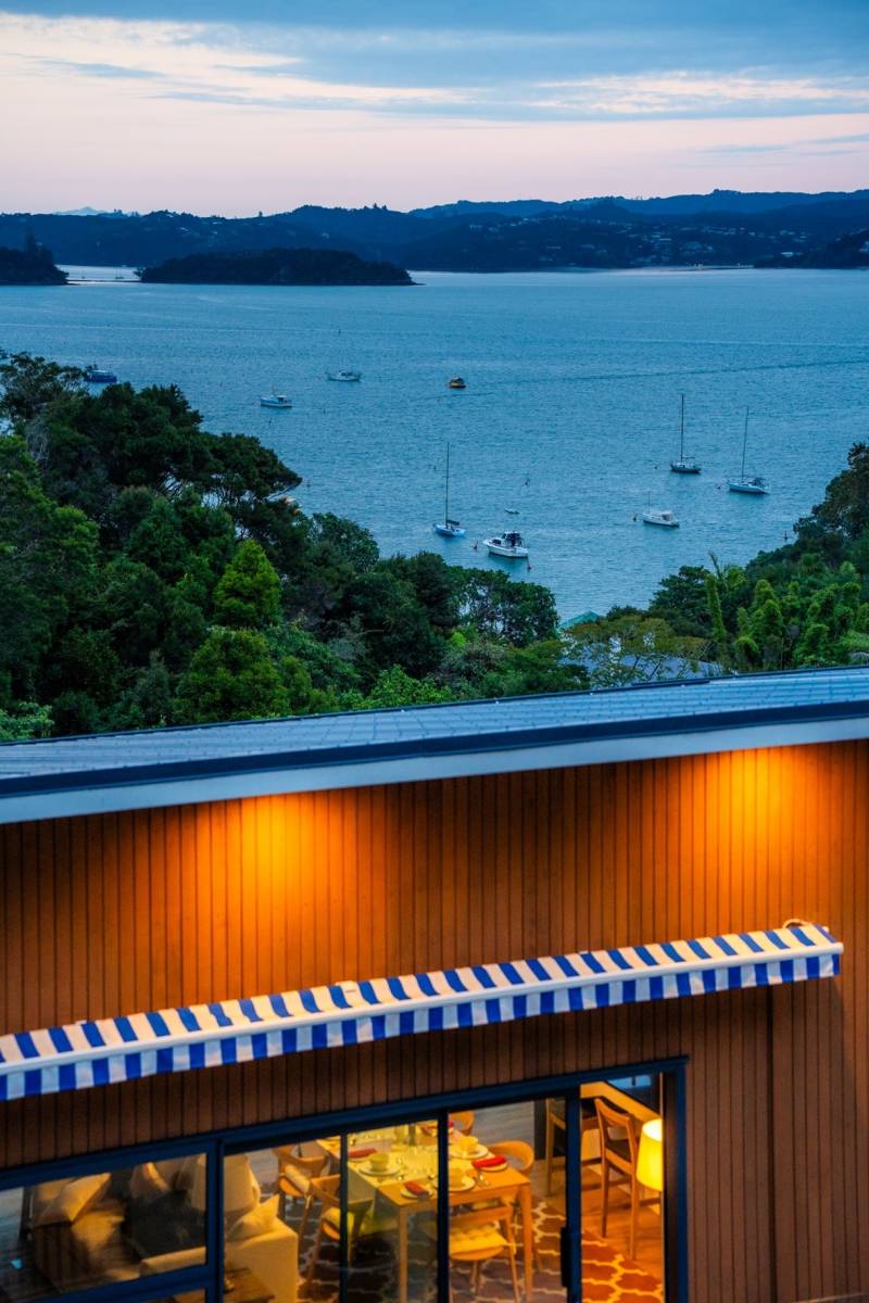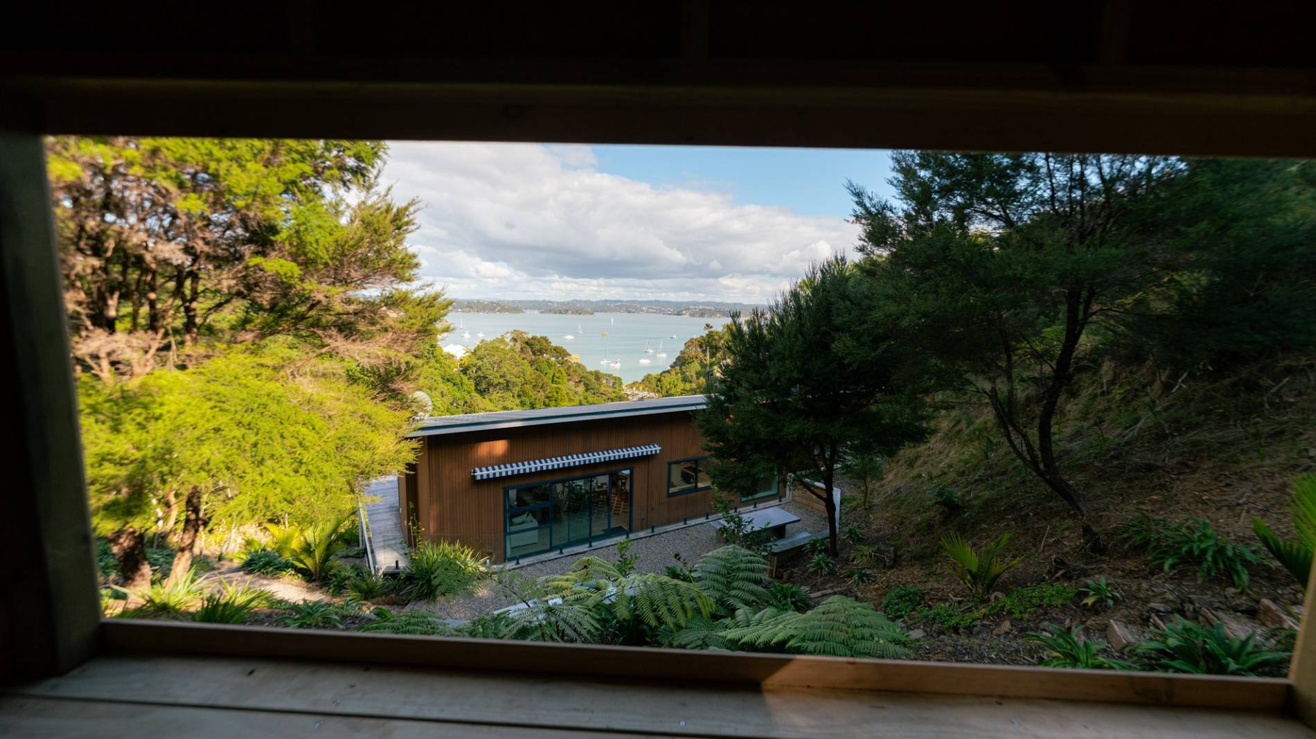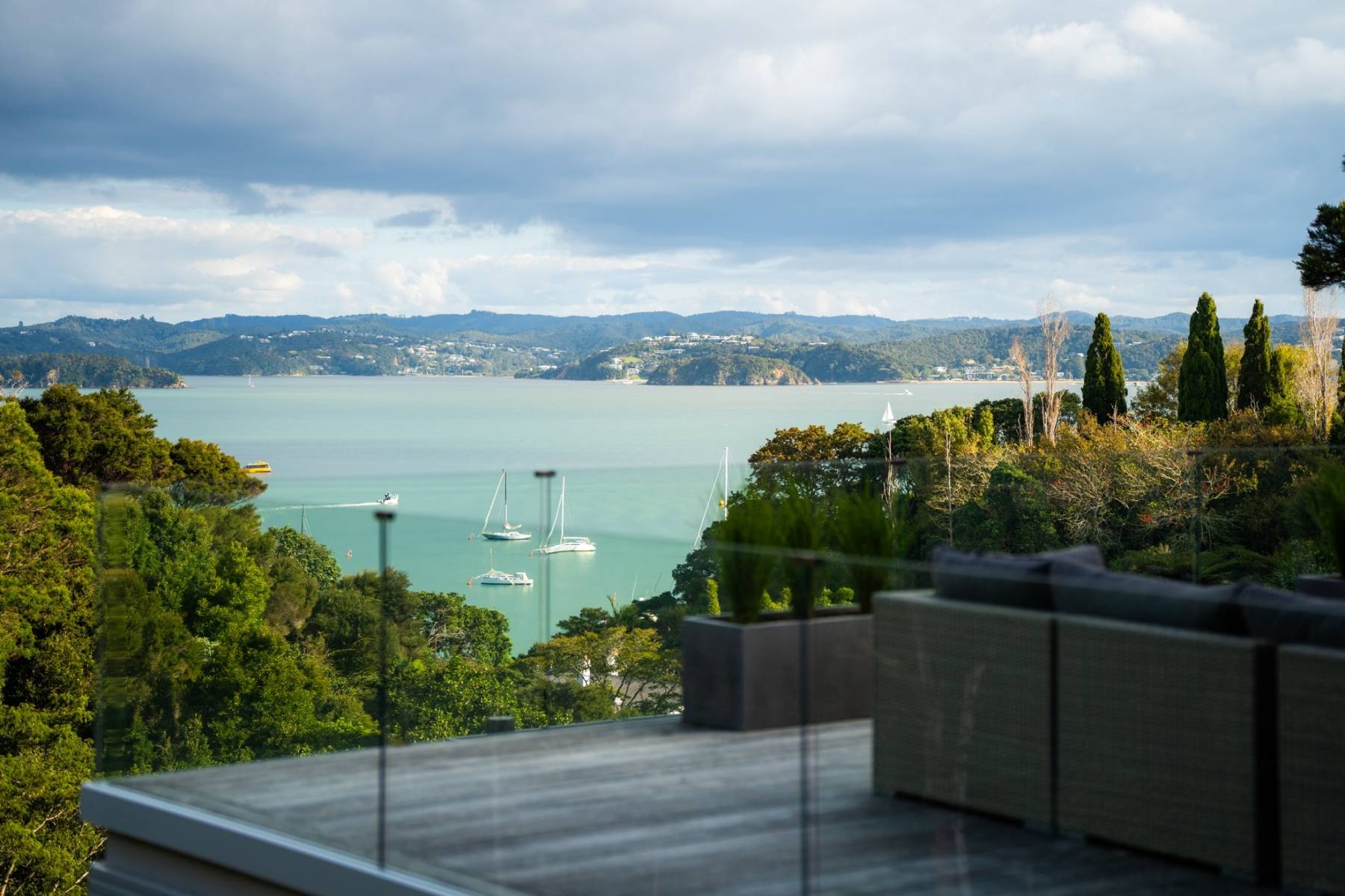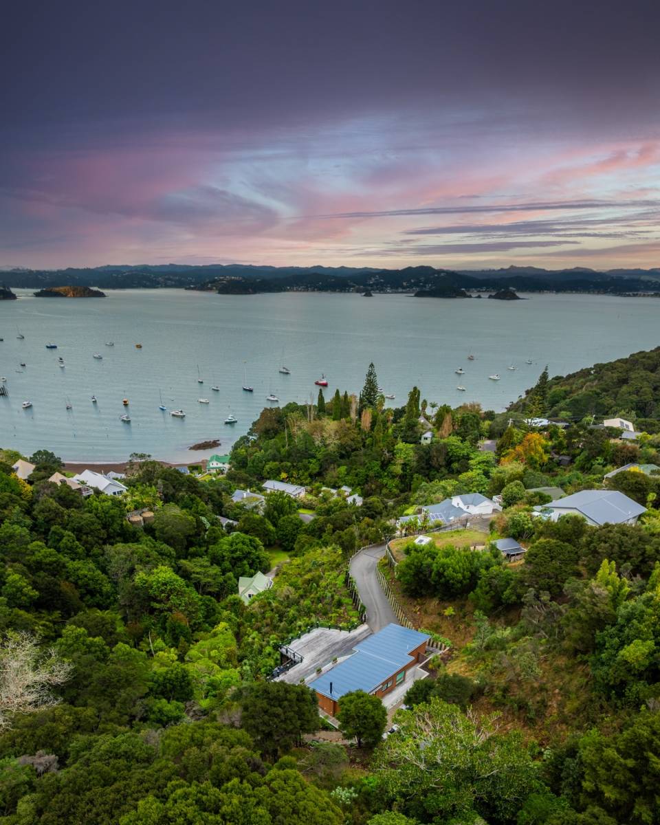 - Above the BBQ area rises an elegant garden showcasing the vibrant beauty of the native flora that includes a stairway to a wooden lookout perched above the property, providing uninterrupted views over Russell and the sparkling waters towards Paihia.