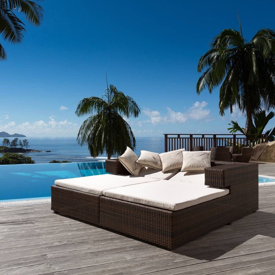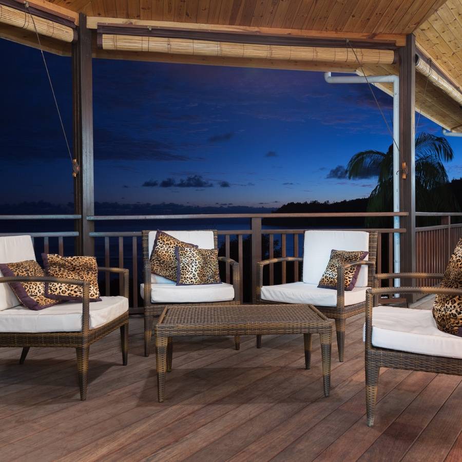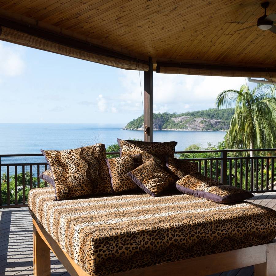 - A spacious terrace with day beds and rattan seating offering spectacular views of the ocean