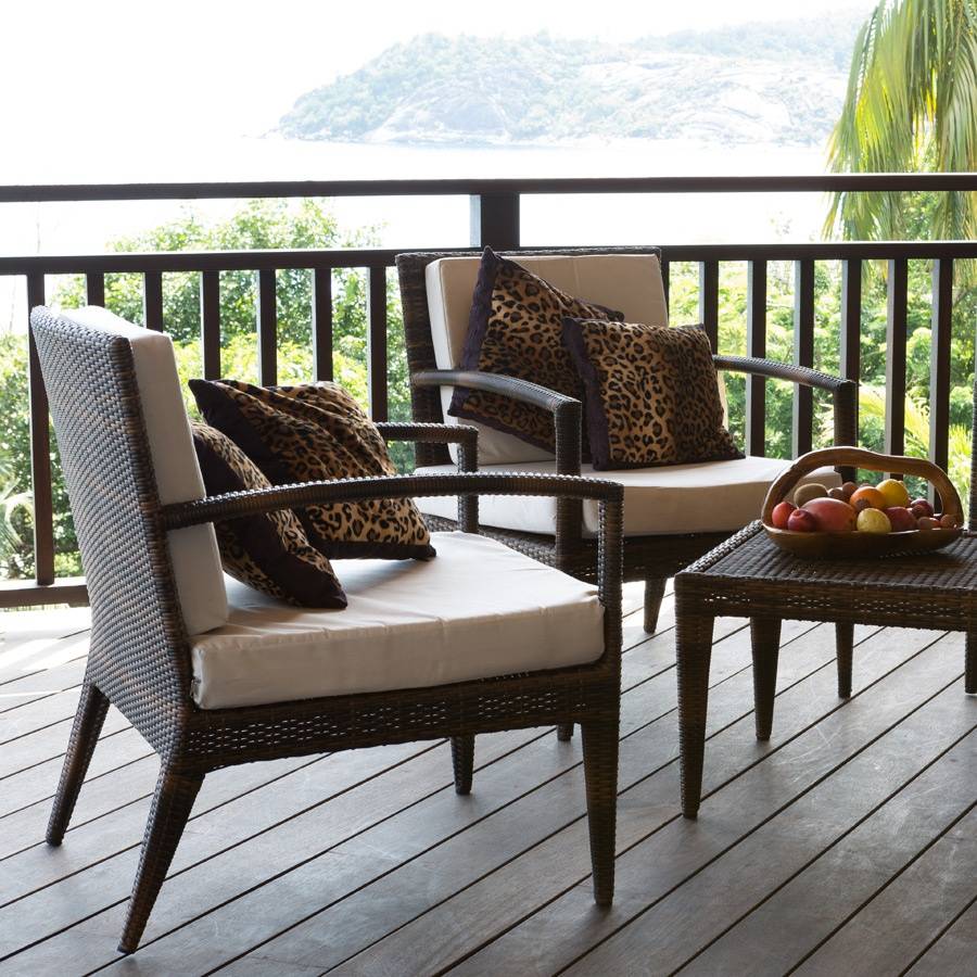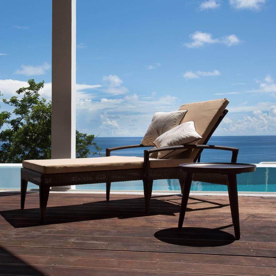 - A spacious terrace with day beds and rattan seating offering spectacular views of the ocean.
