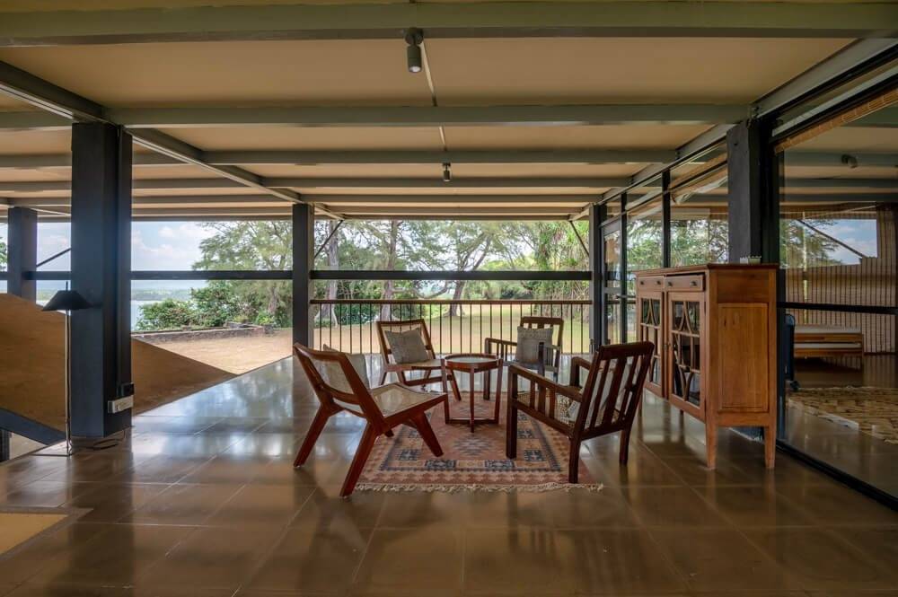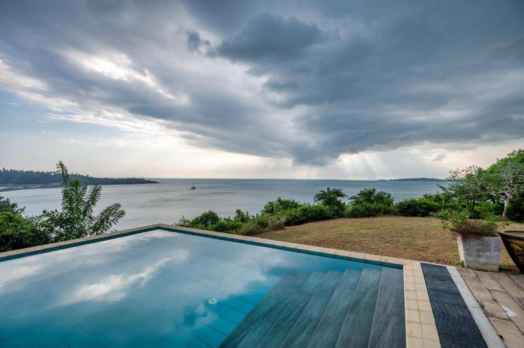 This Geoffrey Bawa designed pavilion offers breathtaking view across Weligama Bay. Close inspection reveals that the coconut trunks are harbouring a platoon of black columns and that a thin horizontal roof is floating amongst their fronds.