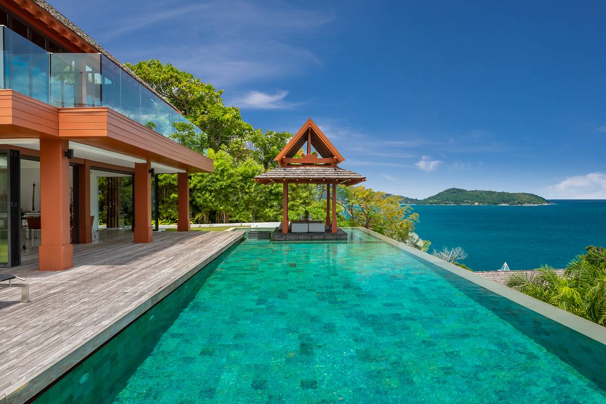 The incredible view isn’t the only highlight of the luxury Baan Santisuk Phuket villa , with a stunning outdoor sala – one of two – well appointed with lounge and dining areas. The large infinity pool is another popular feature, surrounded by stylish timber decking and comfortable deck chairs to enjoy the entire day relaxing by the pool while enjoying the calming view of the turquoise ocean beyond.