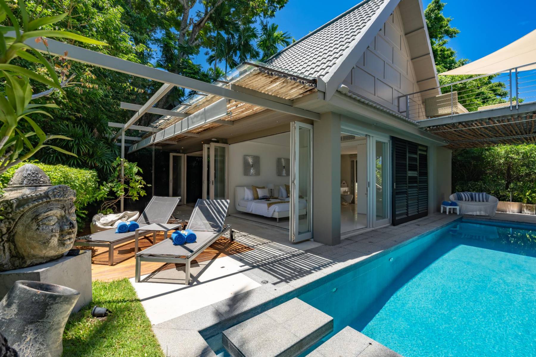 - Living areas: There is an open-plan indoor living, dining, and kitchen area with L-shaped sofa and air conditioning. The outdoor poolside living area has sofas, sunbeds, and BBQ facilities.