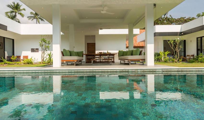 - Living Areas: A stylishly designed modern villa for laid-back indoor and outdoor beachside living. The main house features a large, air conditioned sitting area with a modern L-shaped sofa overlooking the garden. A separate TV lounge with 50”TV can be curtained off for privacy. The dining area comprises a refectory style wooden table for up to 13 serviced by a stylish show kitchen with central counter top, cooking hob and all modern amenities. A wide covered terrace runs the length of the main house on both levels of the house, overlooking the pool and seaview. An airy covered sala sits at the centre of the garden by thepool with two long sofas set around a large coffee table,adjoining this is the outdoor dining table for up to 8 with service bar and kitchen for barbecues and al fresco meals.