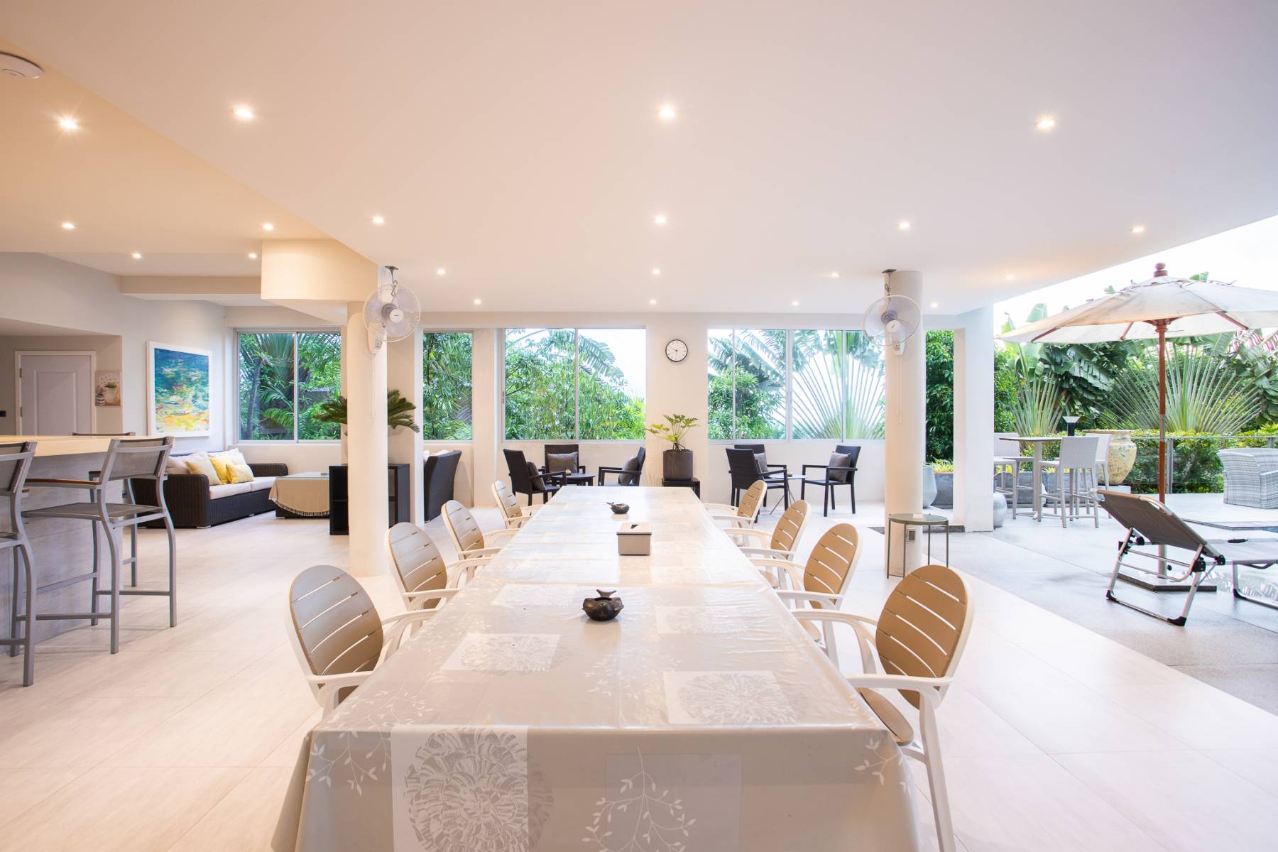 - Full width sliding windows open onto a covered terrace with further dining table and seating and views over the swimming pool to the ocean.