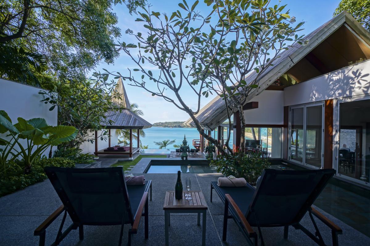 The outside terraced areas feature a pond and an 18-metre long L-shaped infinity pool with a Sala for relaxing or having that outdoor massage. There is adequate room for sunbathing and relaxing on the terraces where the eaves of the roof provide shade if required. The living room has a spectacular view of Surin Bay and Beach and features a balcony the full width of the room – great for sharing sundowners. There is also an outdoor dining area with shade – ideal for breakfasts or outdoor dining.
