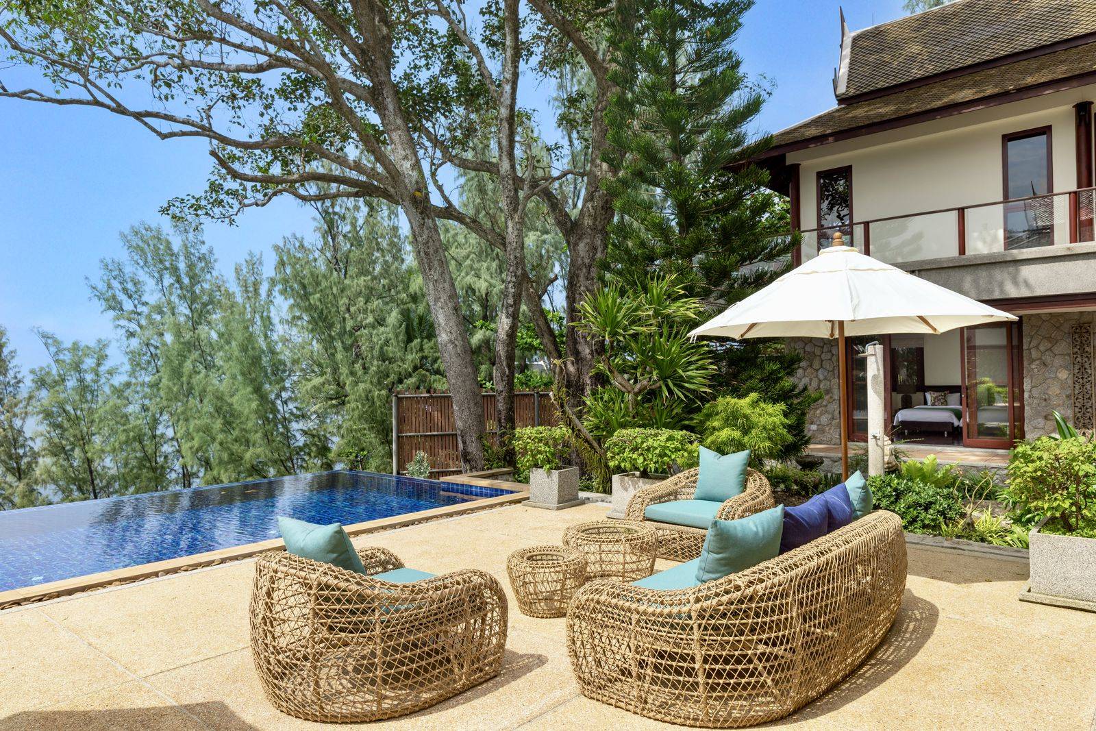 This Luxurious Villa in Phuket lies atop a hill on Phuket's west coast, along Millionaire's Mile. The villa showcases traditional Asian architecture and interior design. However, the convenience of its facilities and amenities are well-kept and modern. It features six bedrooms, each with its private ensuite bathroom, making it an ideal choice for families, couples, or groups of friends of up to 12 people. Modern, comfortable furnishings, Thai-inspired artworks, and ceramic pieces adorn the living areas of this three-story vacation home. Additionally, the interior relishes plenty of natural light and sea breezes due to its open-plan layout and floor-to-ceiling glass doors and windows.
