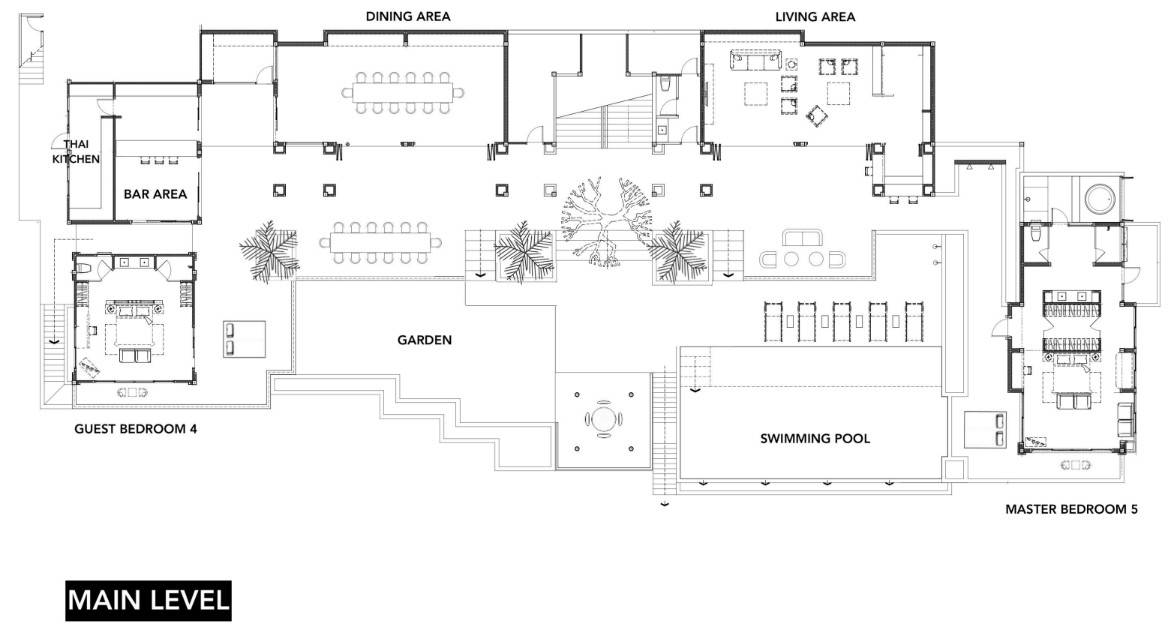 At the center of this air conditioned section stands a solid, timber table that can seat up to 14 guests who may listen to a little music from the Bowers & Wilkins speakers while having a meal, for a more genial atmosphere. Along with this stretch comes a well-equipped kitchen and a Thai kitchen as well. However, the peaceful, neutral colors of the room effortlessly direct the eyes to the stunning view of the magnificent waves, skies, and garden. The outdoors meanwhile, offers many seats around the villa to take advantage of the fresh beach air while dining al-fresco or having a BBQ party.
