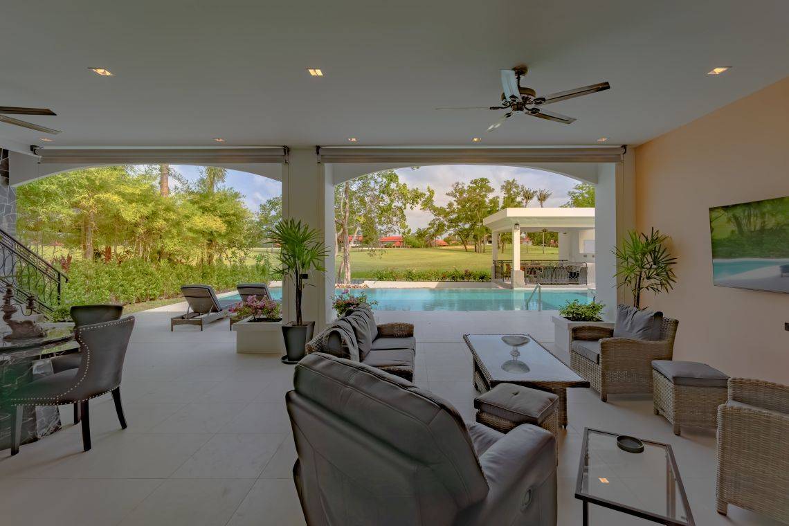 - Patios and Bars: The villa features two large patios with covered seating and dining areas, as well as a bar overlooking the pool and golf course. Motorized drop-roll see-through screen curtains allow youto control the sunlight or rain as you wish.