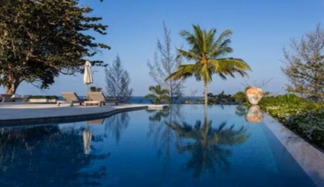 The villa’s centerpiece is a magnificent infinity pool, seems to dissolve into the horizon, framed by manicured lawns that cascade gently toward the sea.